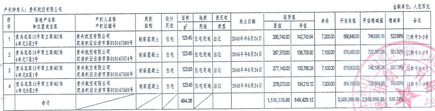 | 資產(chǎn)公告信息 | 資產(chǎn)描述 | 本次標(biāo)的為貴州航空有限公司持有的貴州省貴陽市貴烏北路15號(hào)常立商城四套住宅: 貴州省貴陽市貴烏北路15號(hào)常立商城4單元5層2號(hào),建筑面積123.45(㎡),總價(jià)888840(元); 貴州省貴陽市貴烏北路15號(hào)常立商城4單元7層2號(hào),建筑面積123.45(㎡),總價(jià)876495(元); 貴州省貴陽市貴烏北路15號(hào)常立商城4單元8層1號(hào),建筑面積123.93(㎡),總價(jià)879903(元); 貴州省貴陽市貴烏北路15號(hào)常立商城4單元9層2號(hào),建筑面積123.45 (㎡),總價(jià)864150(元)。 | |||||