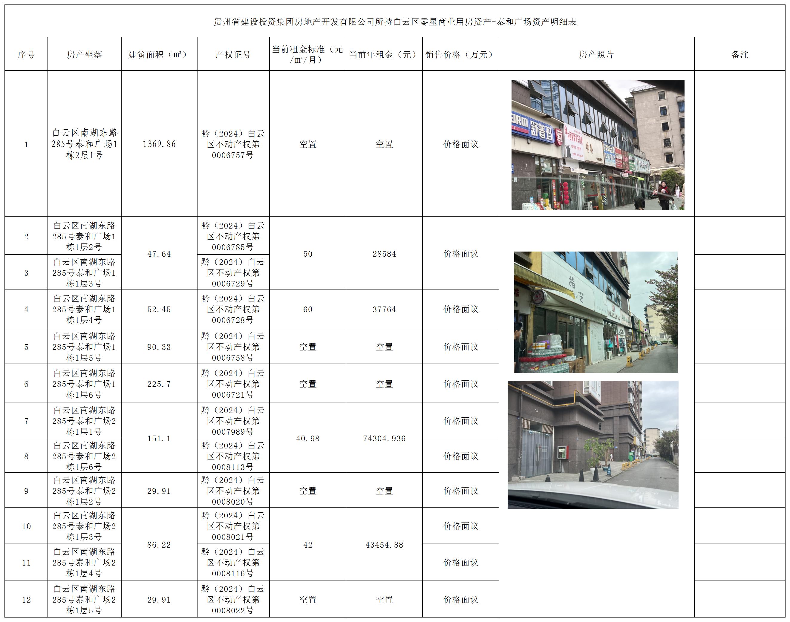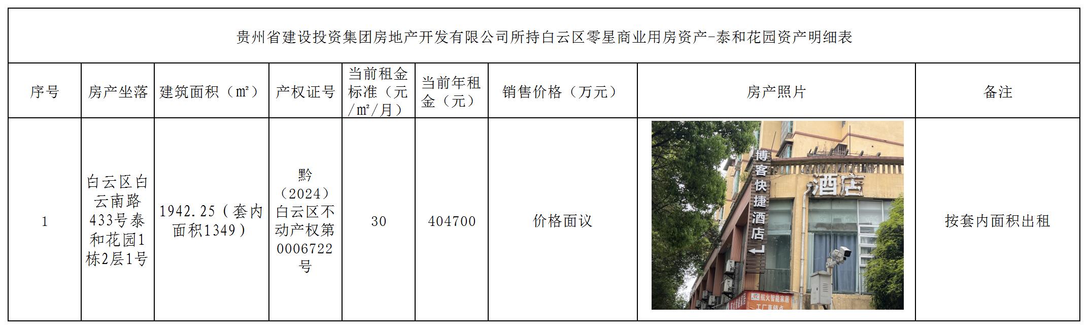 貴州省建設(shè)投資集團(tuán)房地產(chǎn)開發(fā)有限公司(以下簡稱:貴州建投房開)所持白云區(qū)零星商業(yè)用房資產(chǎn)項目分別位于泰和花園449號、泰和花園433號、泰和大廈和泰和廣場四宗。